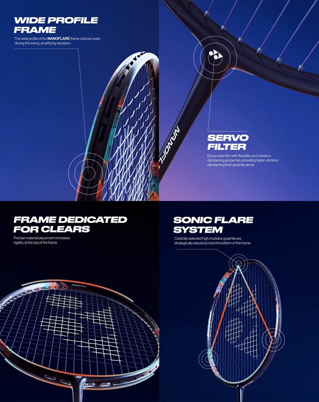 Die Yonex Nanoflare 700 Pro ist das Update des ersten Nanoflare 700 von vor einigen Jahren. Dies ist die 4Ug5-Version, also sowohl leicht als auch grifflastig – eine Kombination, die Schnelligkeit garantiert. Zudem ist es ein Mid-Flex-Racket, wobei besonders der dickere Rahmen auffällt. Früher waren schwere Schläger meist dicker und leichtere Schläger dünner; Yonex stellt dies mit der Nanoflare-Serie auf den Kopf, da dieser leichte, schnelle Rahmen etwas dicker als der Durchschnitt ist.